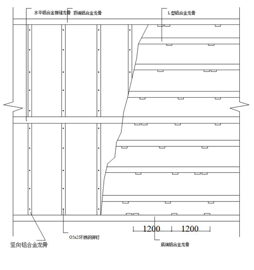 1)在安裝豎向鋁合金龍骨之前,應先確定頂端鋁合金龍骨與水平接縫鋁合金龍骨以及水平接縫鋁合金龍骨與底端鋁合金龍骨之間的距離,便于裁切豎向鋁合金龍骨。根據圖紙上的設計在豎向鋁合金龍骨和L型鋁合金龍骨上打眼。