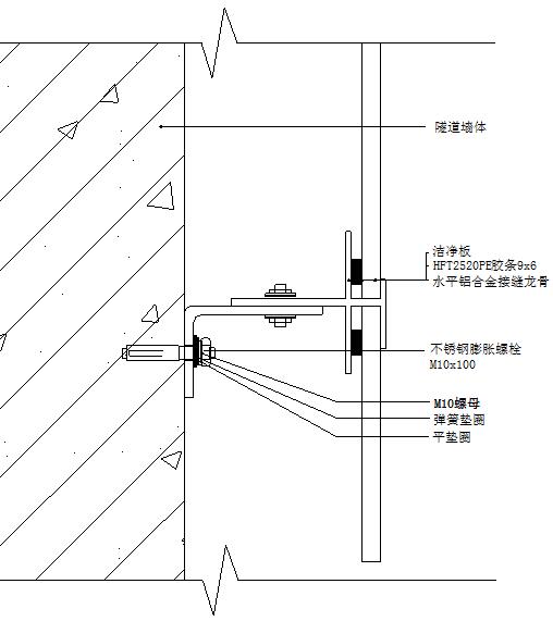 根據設計圖紙,在隧道側墻壁上彈線,定位;定出各龍骨在支座上的連接點。在定好位置的地方用不銹鋼膨脹螺栓(M10×100)把支座連接在墻上,固定時應保證支座水平。(注意:設計圖紙上固定支座的定位,只是一般規則性的定位,未考慮接縫的誤差,龍骨接縫的誤差以及施工中的誤差,因此在施工中可根據實際情況,在作適當的調整。)