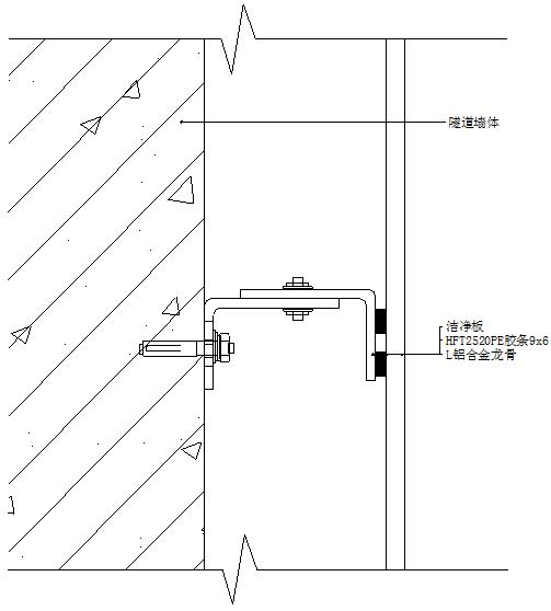 3)隧道防火板的安裝由下至上依次順序安裝,先將第一塊粘貼PE膠條的裝飾板嵌入底端鋁合金龍骨的槽內,板的上端由水平接縫鋁合金龍骨下槽固定,并將板壓實在龍骨上,確保龍骨與板的粘接。