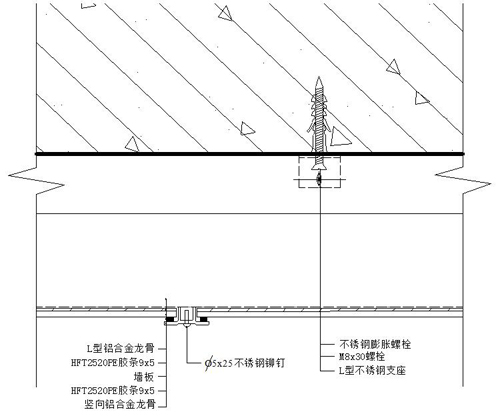 2)確認好距離后,在豎向鋁合金龍骨的兩翼內側粘貼PE(9×5mm)膠條,將其粘接在板面上,,再用不銹鋼鉚釘(Φ5×25mm)將其固定在L型鋁合金龍骨上。