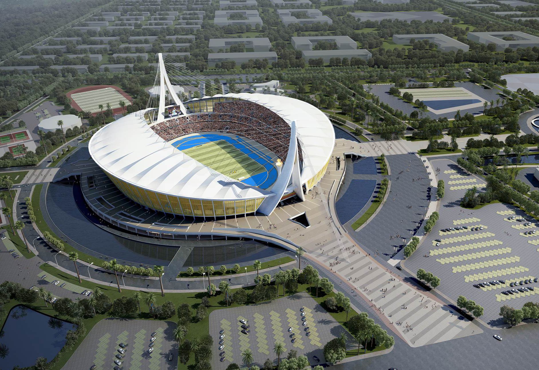 體育場設計方案由柬王國首相洪森親自選定,整體造型恰似一艘帆船,氣勢恢宏、姿態優美,像一艘滿載著中柬友誼的帆船。柬埔寨體育場項目為中國政府迄今對外援助中規模最大、等級最高的體育場。體育場建成后將成為2023年東南亞運動會的主要場館。